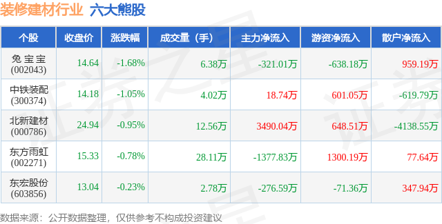 证券之星动静,沪指报收3913。72,较前一买卖日上涨0。63%。拆建筑材行业全体表示较弱,较前一买卖日上涨0。44%,29只个股上涨,6只个股下跌。个股表示方面,拆建筑材行业当日领跌股为兔 宝 宝(002043),该股当日报收14。64,下跌1。68%,成交量6。38万,从力资金净流出321。01万元。该股当日成交量4。02万,从力资金净流入18。74万元。除此之外,北新建材(000786)、东方雨虹(002271)、东宏股份(603856)均进入当日熊股之列。具体个股列表见下表: