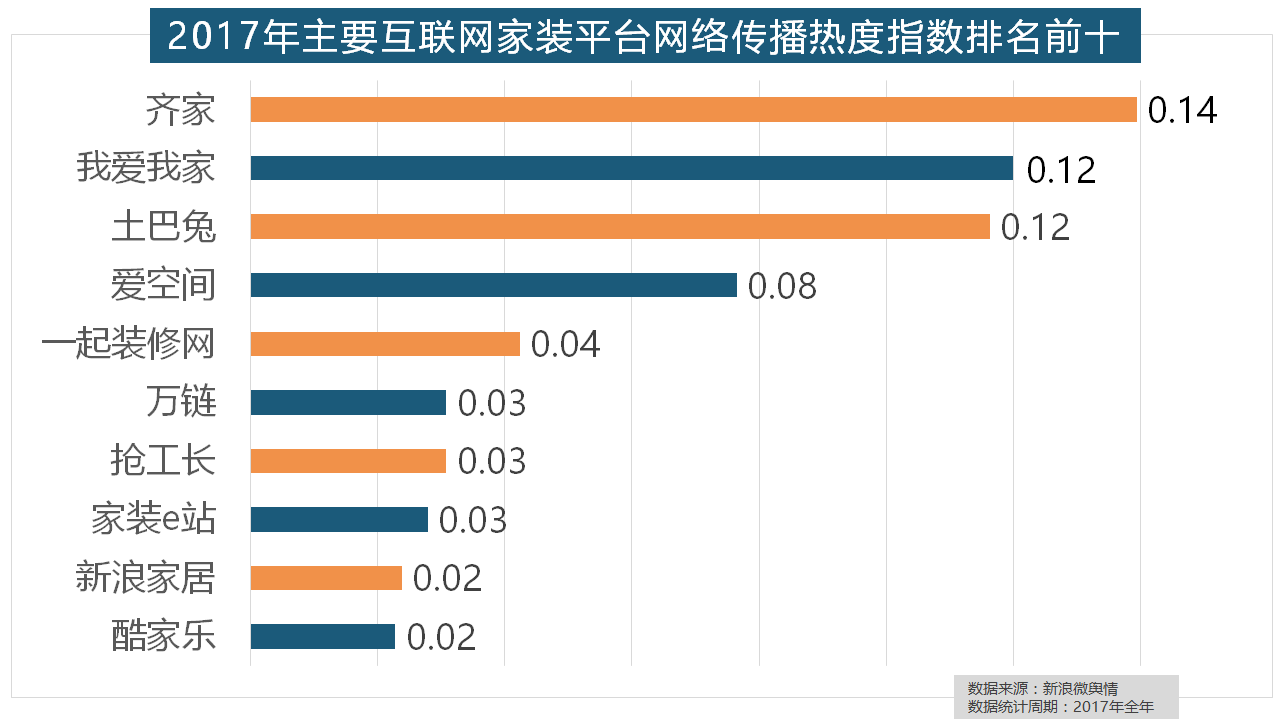 除各保守家拆设想企业逐鹿我国度拆市场外,近年来,一众互联网家拆平台也前来分一杯羹。据新浪微舆情对我国次要互联网家拆平台大数据阐发显示,2017年,齐家、我爱我家、土巴兔、爱空间、一路拆修网的收集热度指数排名前五,万链、抢工长、家拆e坐、新浪家居、